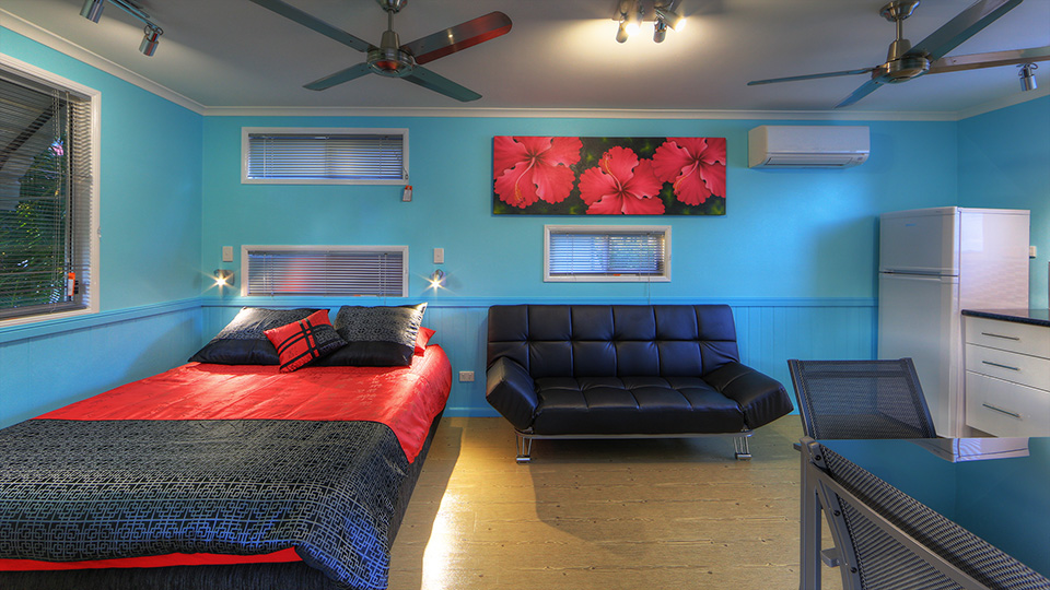 Our modern Studio Ensuite Cabins are the perfect retreat for couples or solo travelers looking for convenience and relaxation. Each cabin is fully self-contained, offering the privacy and convenience of your own space. Tastefully decorated in coastal hues and nestled in lush tropical gardens.