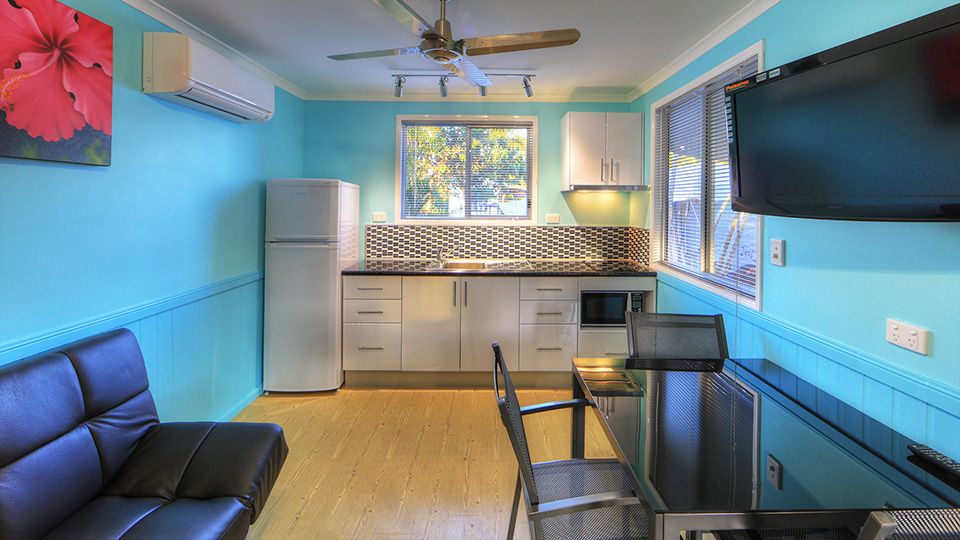 Our One Bedroom Ensuite Cabin has all the things to make your stay comfortable and enjoyable. A separate bedroom with its own smart TV and reverse cycle air conditioning, pillow topped double bed and overhead fan. There is a set of bunks in the centre and dining lounge area at the front with its own reverse cycle air conditioner and overhead fan.